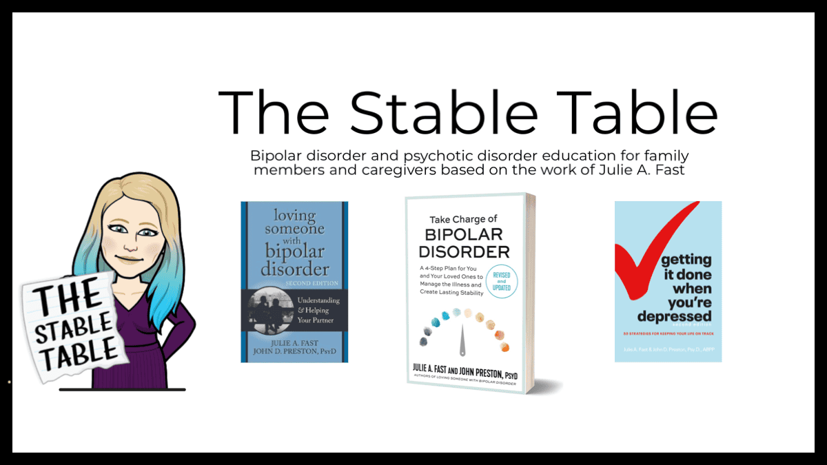The Stable Table on Facebook is a private group for family members, caregivers and health care professionals. It has many posts on bipolar and psychosis treatment and management, medications, substances that affect the bipolar brain such as cannabis, working with health care professionals, communication during a mood swing and more. The group helps people use Take Charge of Bipolar Disorder, Loving Someone with Bipolar Disorder and Getting it Done When You’re Depressed with loved ones.